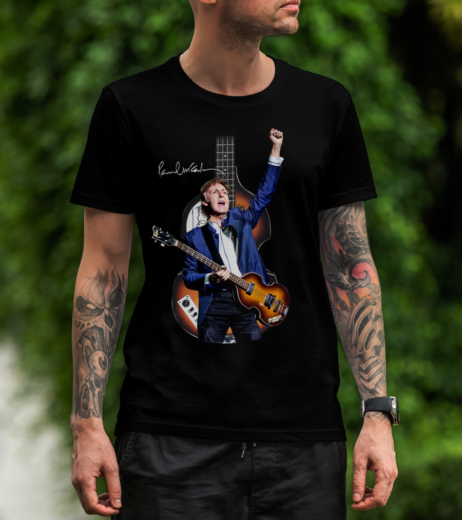 Paul McCartney Signature Bass Guitar Iconic Imagery With Raised Fist T-Shirt