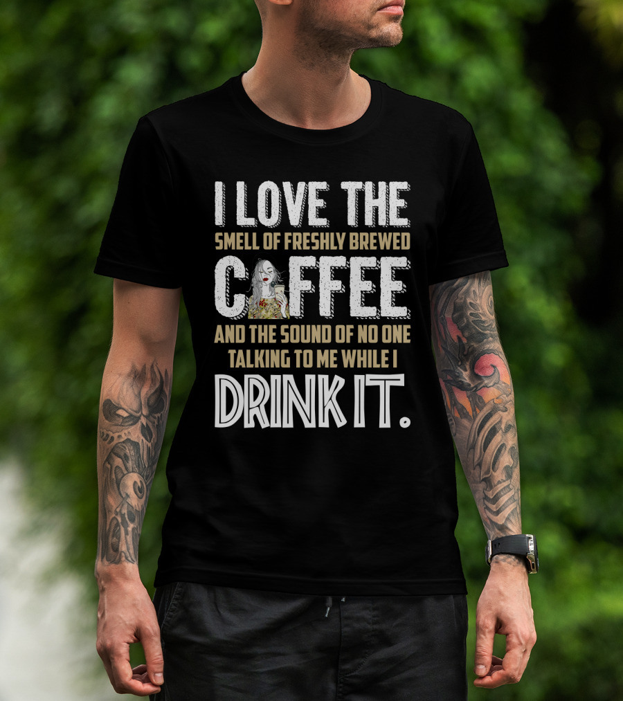 The I Love The Smell Of Freshly Brewed Coffee And The Sound Of No One Talking To Me While I Drink It T-shirt is designed for everyday wear and a consistent fit. Fabric is pre-shrunk ring-spun cotton with durable stitching. See the size chart below for exact measurements.