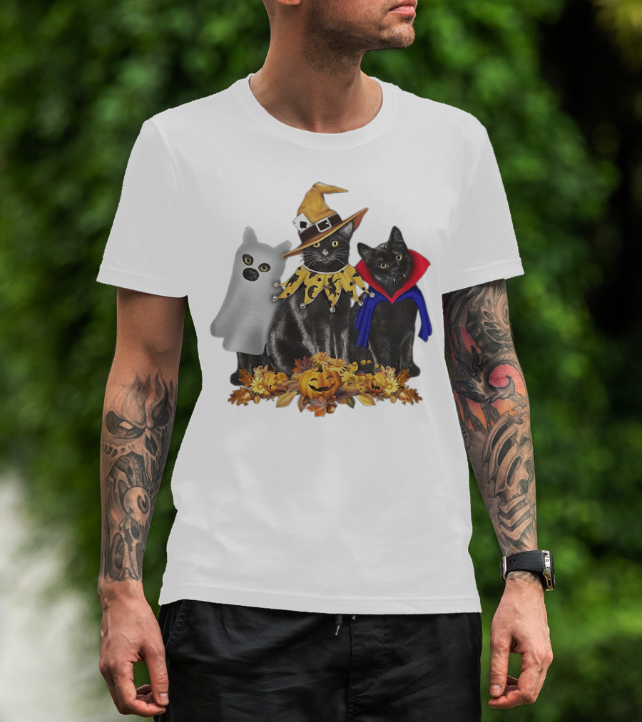 Black Cat Witch Boo Vampire Halloween With Pumpkins And Ghost Costume T-Shirt