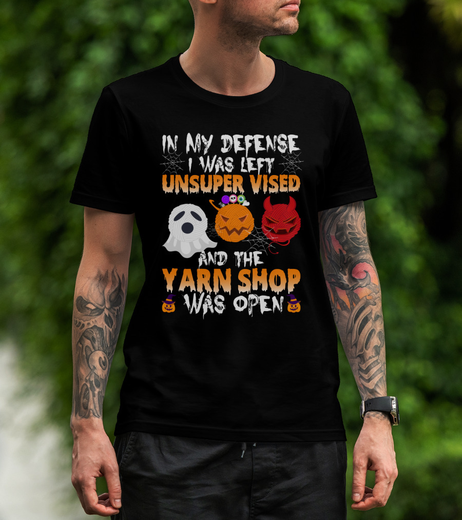 The In My Defense I Was Left Unsupervised And The Yarn Shop Was Open Ghost Pumpkin Devil Halloween T-shirt is designed for everyday wear and a consistent fit. Fabric is pre-shrunk ring-spun cotton with durable stitching. See the size chart below for exact measurements.