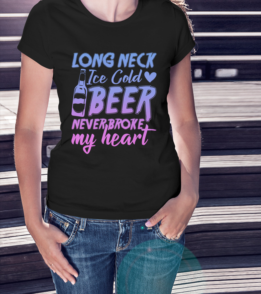 The Long Neck Ice Cold Beer Never Broke My Heart Funny Drinking Bottle Heart T-shirt is designed for everyday wear and a consistent fit. Fabric is pre-shrunk ring-spun cotton with durable stitching. See the size chart below for exact measurements.