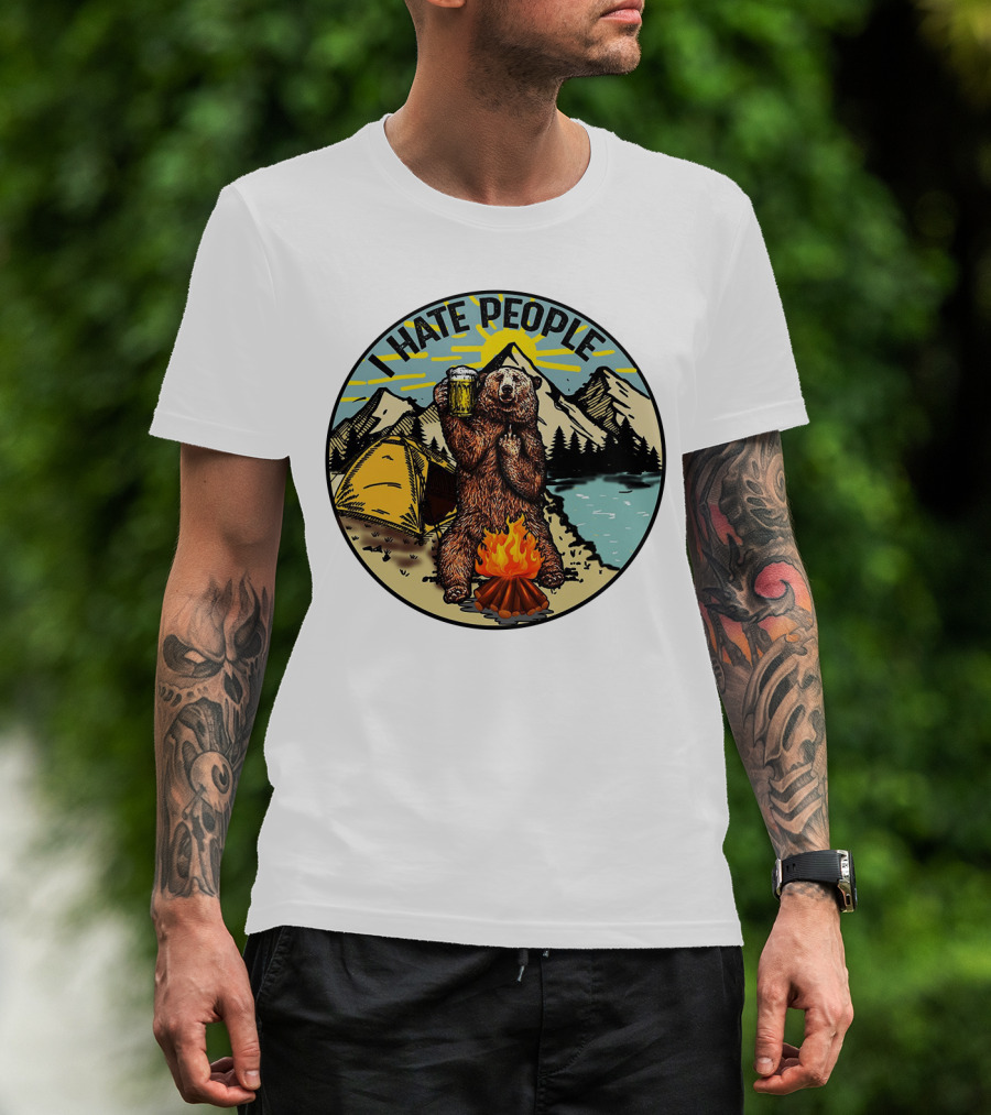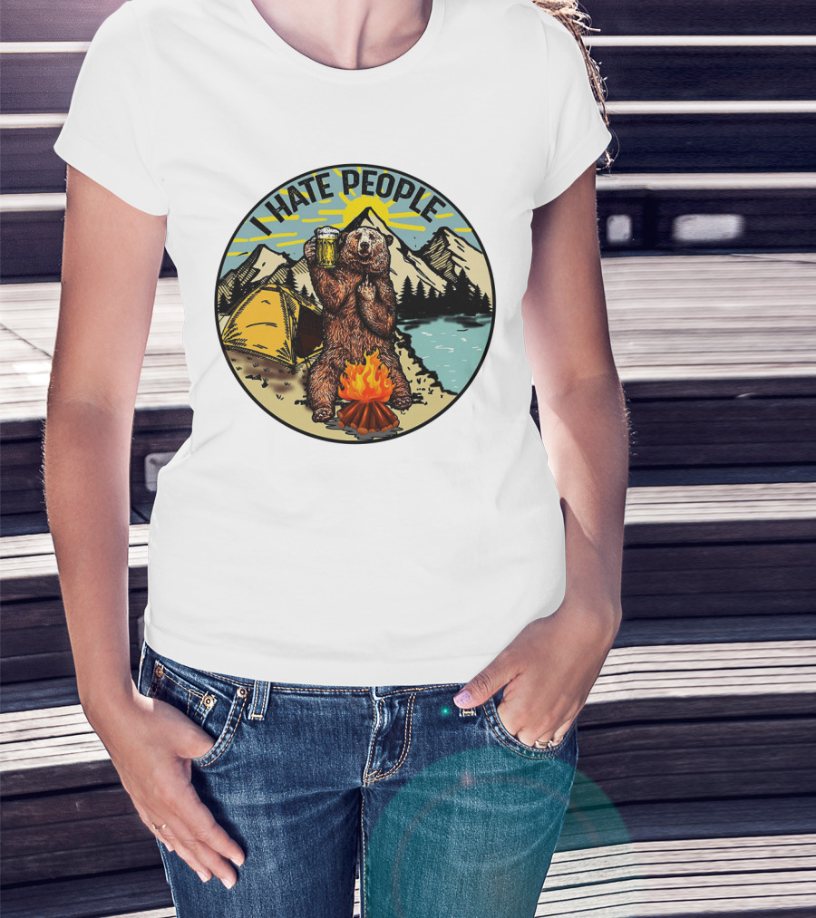 I Hate People Funny Sarcastic Camping Bear With Beer By Campfire T-Shirt