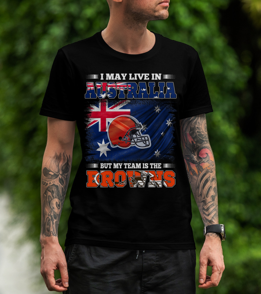 The I May Live in Australia But My Team is the Browns Football Helmet in Front of Australian Flag T-shirt is designed for everyday wear and a consistent fit. Fabric is pre-shrunk ring-spun cotton with durable stitching. See the size chart below for exact measurements.