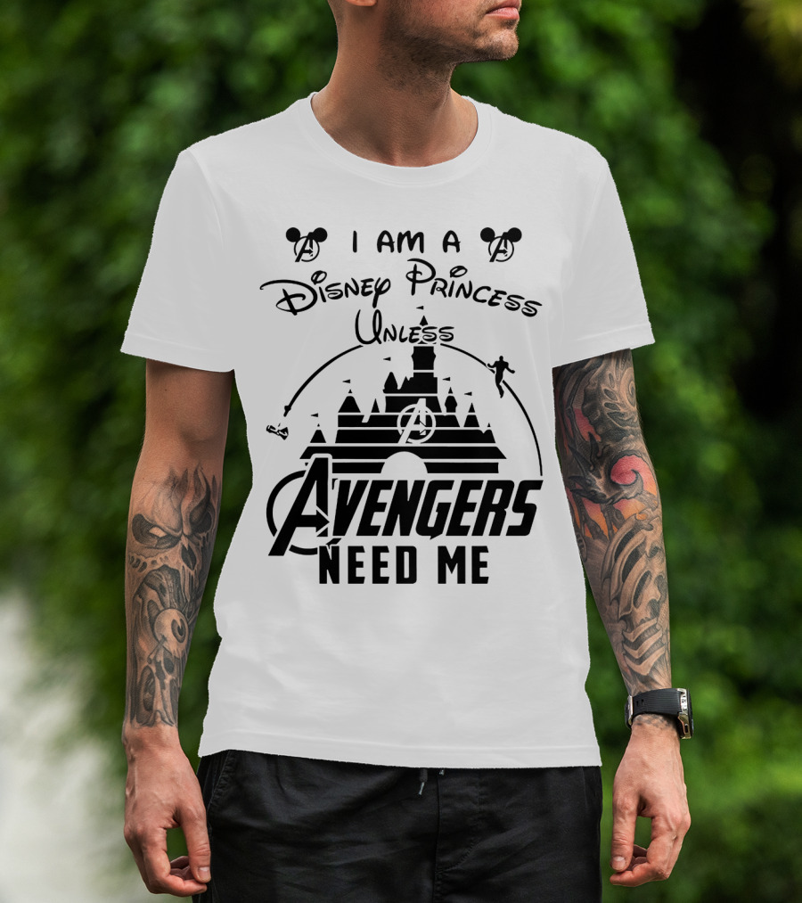 The I Am a Disney Princess with Mickey Mouse and Avengers Castle Icons Unless Avengers Need Me T-shirt is designed for everyday wear and a consistent fit. Fabric is pre-shrunk ring-spun cotton with durable stitching. See the size chart below for exact measurements.