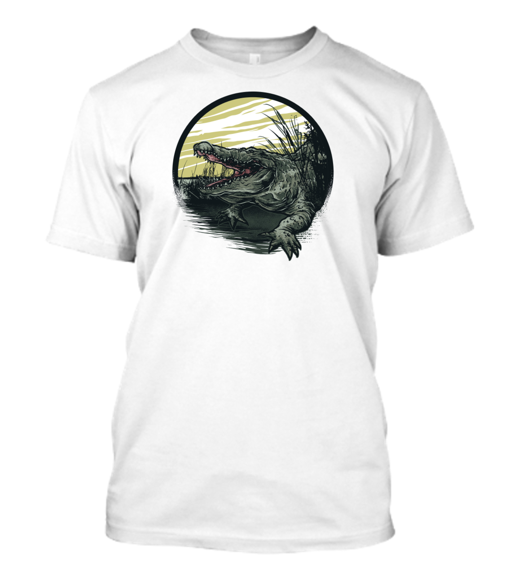 The Amazing Crocodile in Swamp Sunset T-shirt is designed for everyday wear and a consistent fit. Fabric is pre-shrunk ring-spun cotton with durable stitching. See the size chart below for exact measurements.