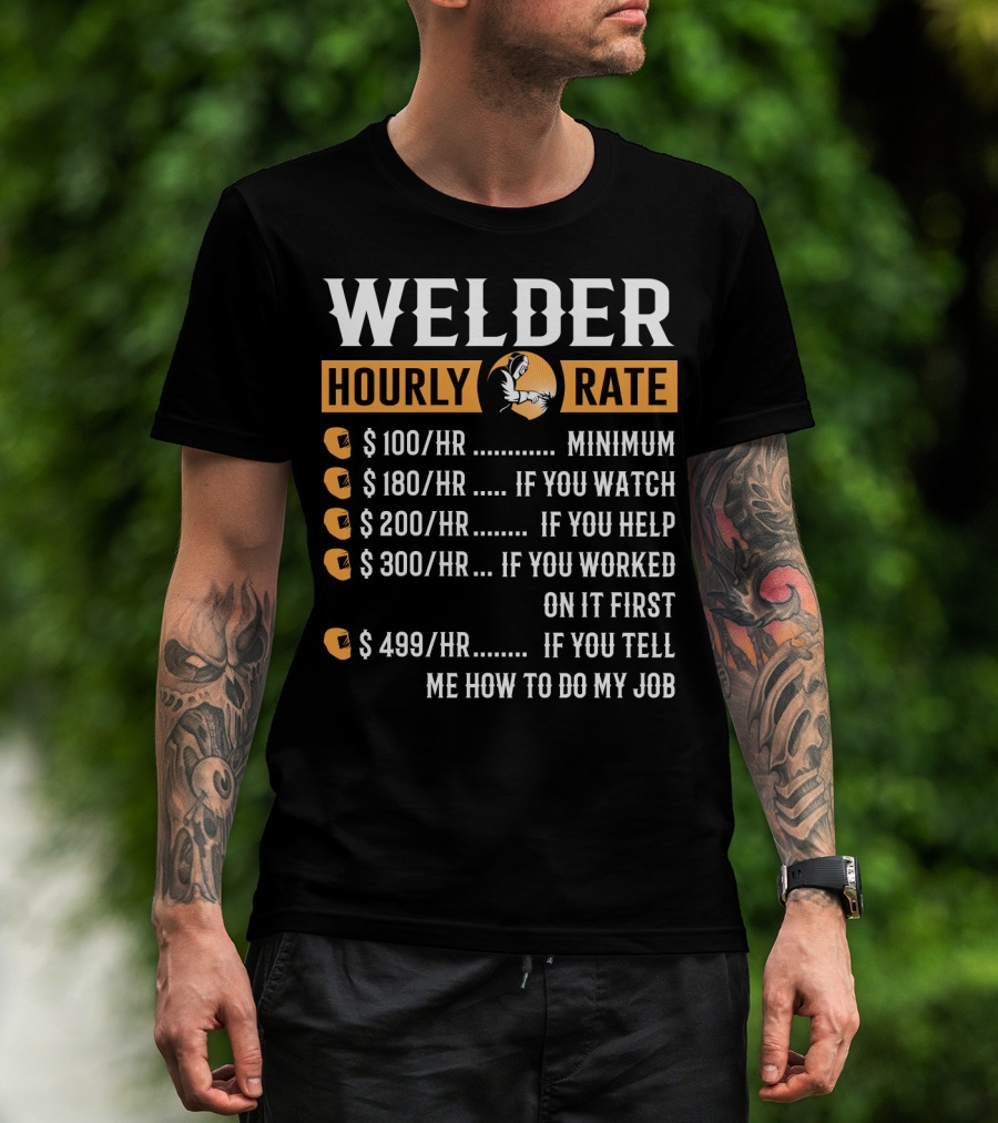 The Humorous Welder Hourly Rate Minimum Watching Helping Working Advice T-shirt is designed for everyday wear and a consistent fit. Fabric is pre-shrunk ring-spun cotton with durable stitching. See the size chart below for exact measurements.