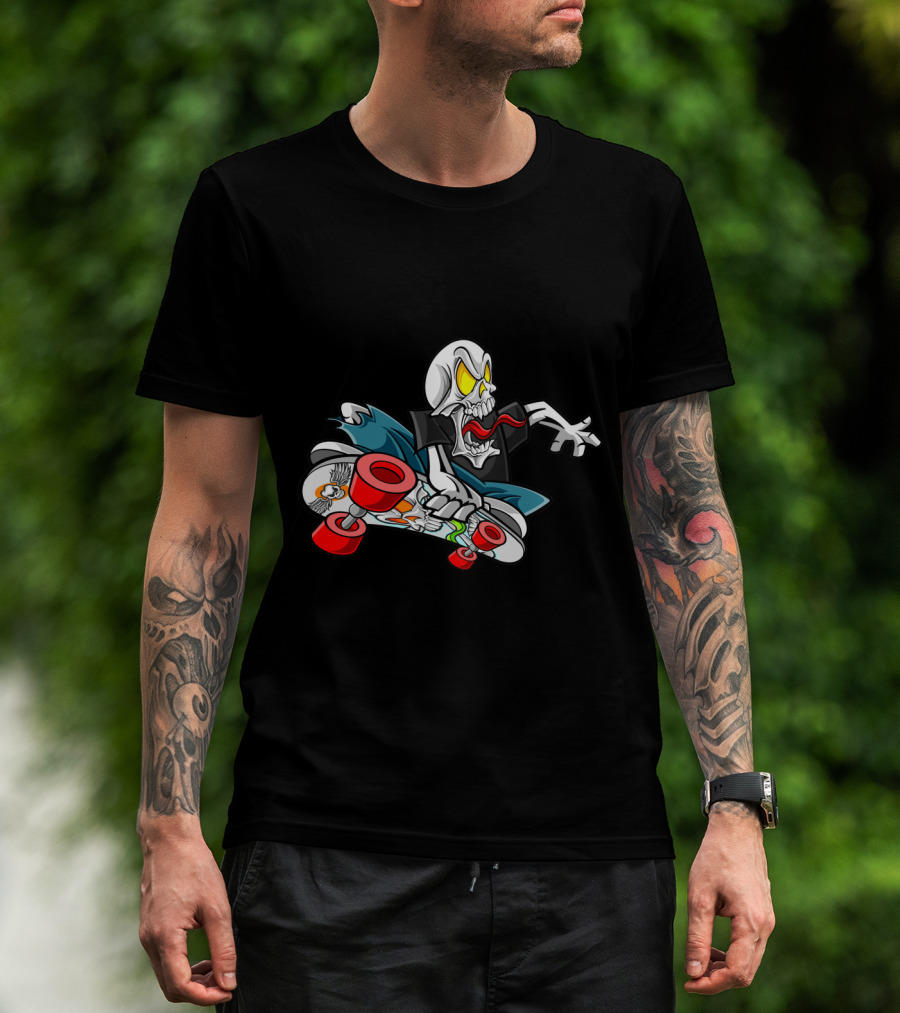 Halloween Skull Skateboarder With Red Wheels And Yellow Eyes T-Shirt