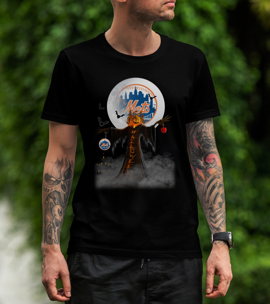 New York Mets Pumpkin Head Halloween Theme With Moon, Bats, And Spooky Castle T-Shirt