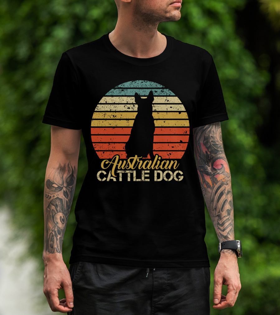 Retro Australian Cattle Dog Silhouette With Vintage Striped Sunset T-Shirt