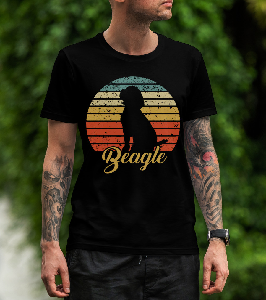 The Vintage Beagle Silhouette with Retro Sunset Stripes T-shirt is designed for everyday wear and a consistent fit. Fabric is pre-shrunk ring-spun cotton with durable stitching. See the size chart below for exact measurements.