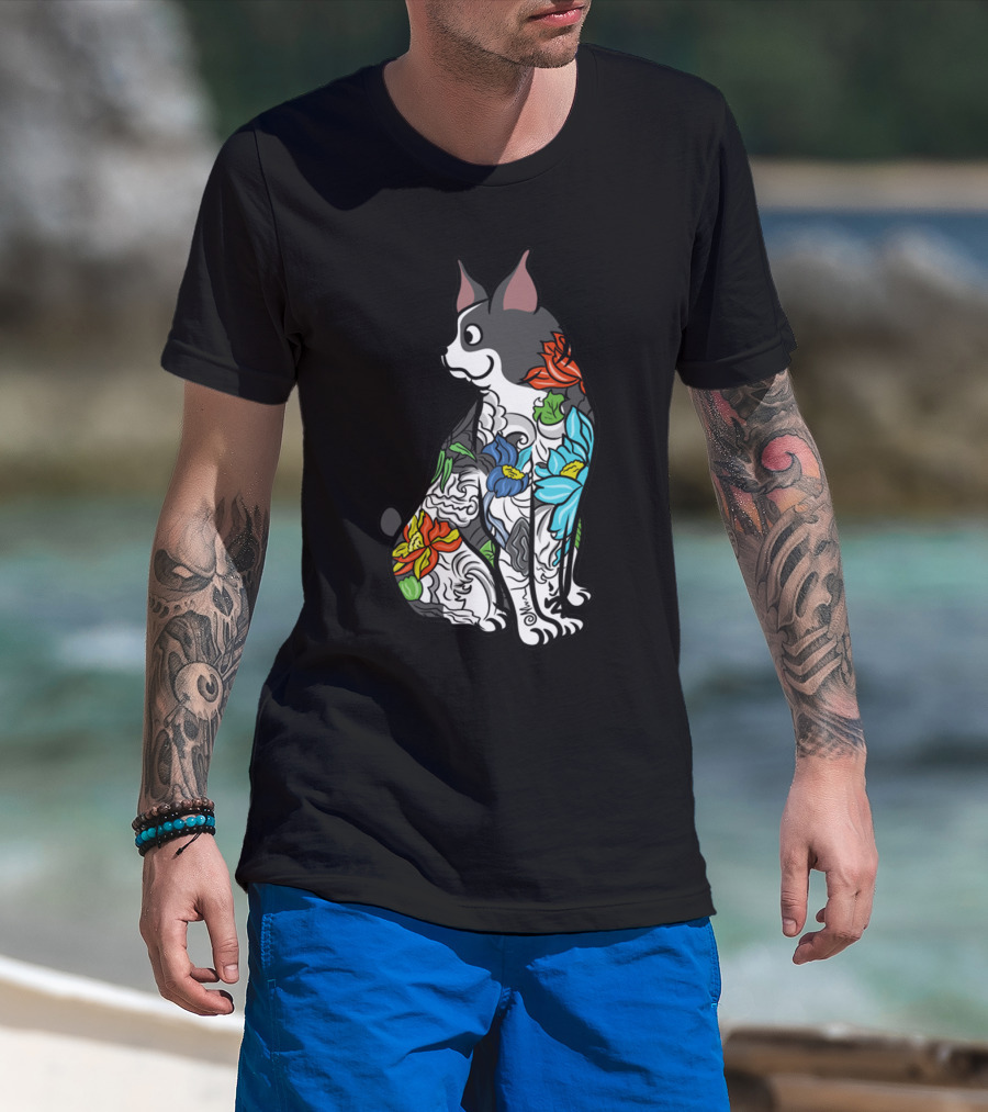 Boston Terrier With Colorful Floral Tattoo T-Shirt