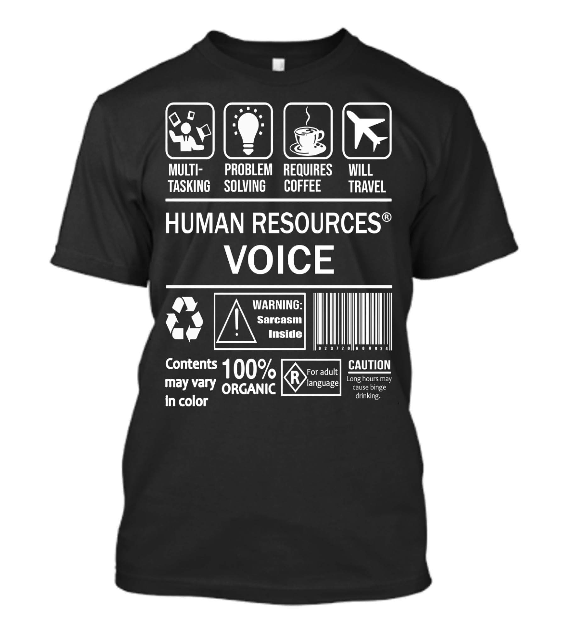 The Multitasking Problem Solving Requires Coffee Will Travel Human Resources Voice Warning Sarcasm Inside 100% Organic Caution Adult Language T-shirt is designed for everyday wear and a consistent fit. Fabric is pre-shrunk ring-spun cotton with durable stitching. See the size chart below for exact measurements.
