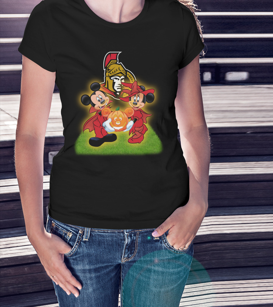 Mickey And Minnie Halloween Fun With Ottawa Senators Logo And Pumpkin T-Shirt
