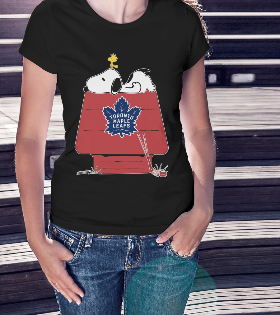 Snoopy And Woodstock With Toronto Maple Leafs Logo On Red House With Hockey Sticks T-Shirt