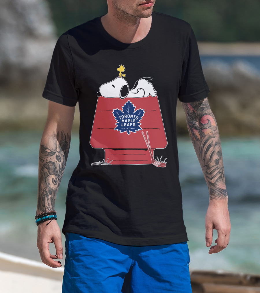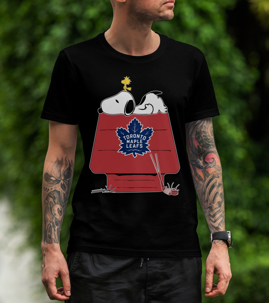 The Snoopy and Woodstock with Toronto Maple Leafs Logo on Red House with Hockey Sticks T-shirt is designed for everyday wear and a consistent fit. Fabric is pre-shrunk ring-spun cotton with durable stitching. See the size chart below for exact measurements.