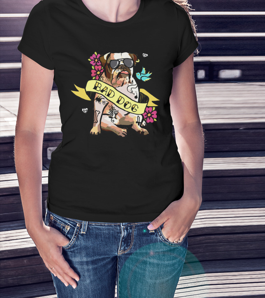 BAD DOG BULLDOG WITH TATTOOS AND SUNGLASSES AMIDST FLOWERS AND BLUEBIRD T-Shirt