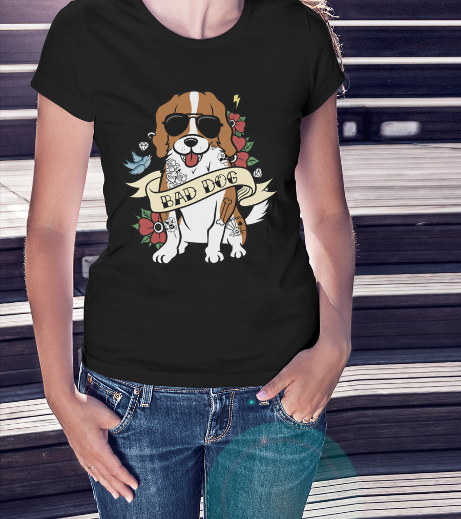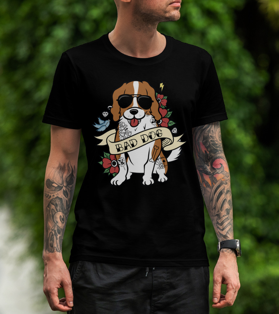 Cavalier Bad Dog With Tattoos And Sunglasses Surrounded By Flowers And Symbols T-Shirt