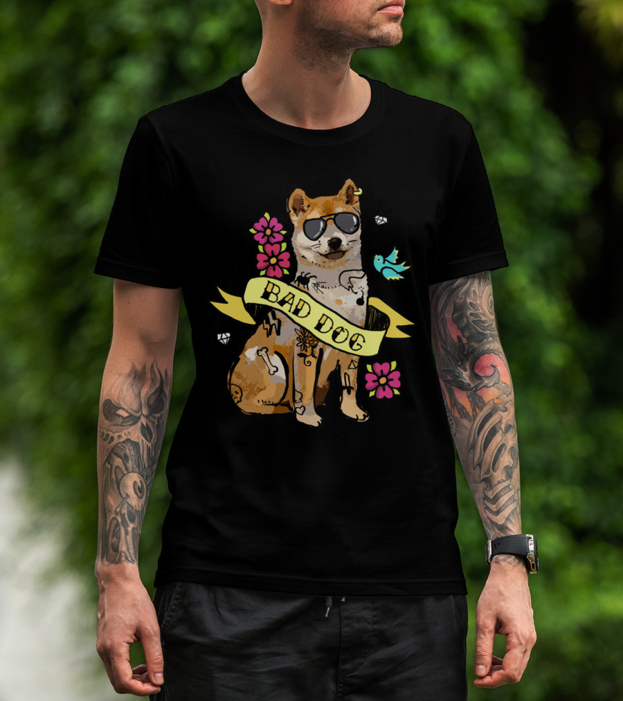 Shiba Inu Bad Dog With Sunglasses And Tattoos Ribbon Art Flowers Bird Diamond T-Shirt