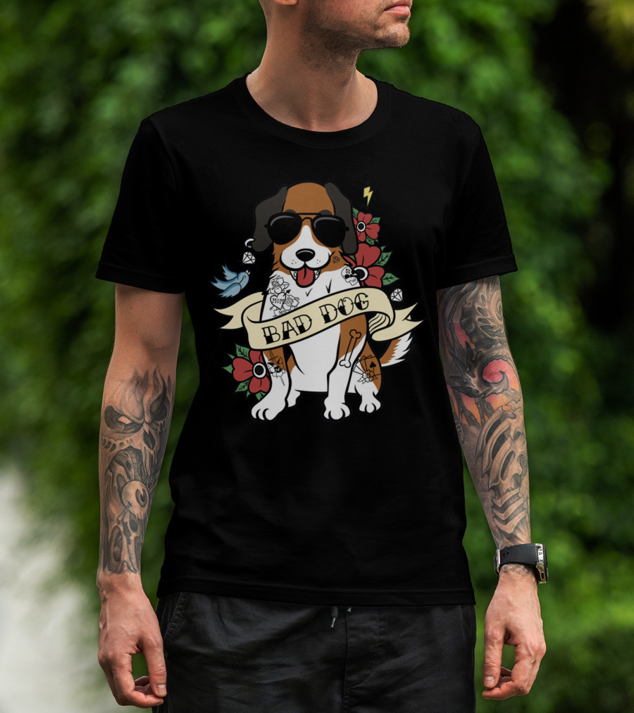 The St Bernard Bad Dog Sunglasses Tattoo Flowers Bird Lightning Jewelry T-shirt is designed for everyday wear and a consistent fit. Fabric is pre-shrunk ring-spun cotton with durable stitching. See the size chart below for exact measurements.