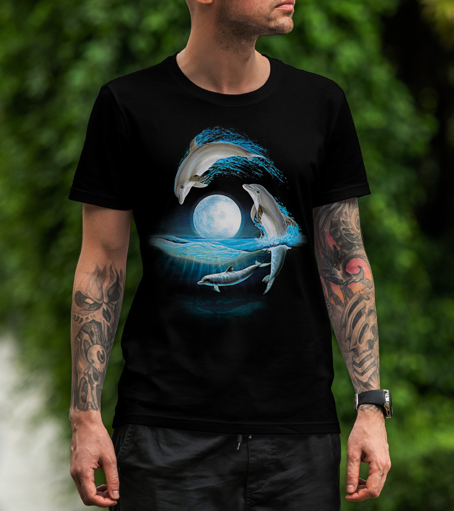 Full Moon Dolphin Leap Ocean Waves T-Shirt