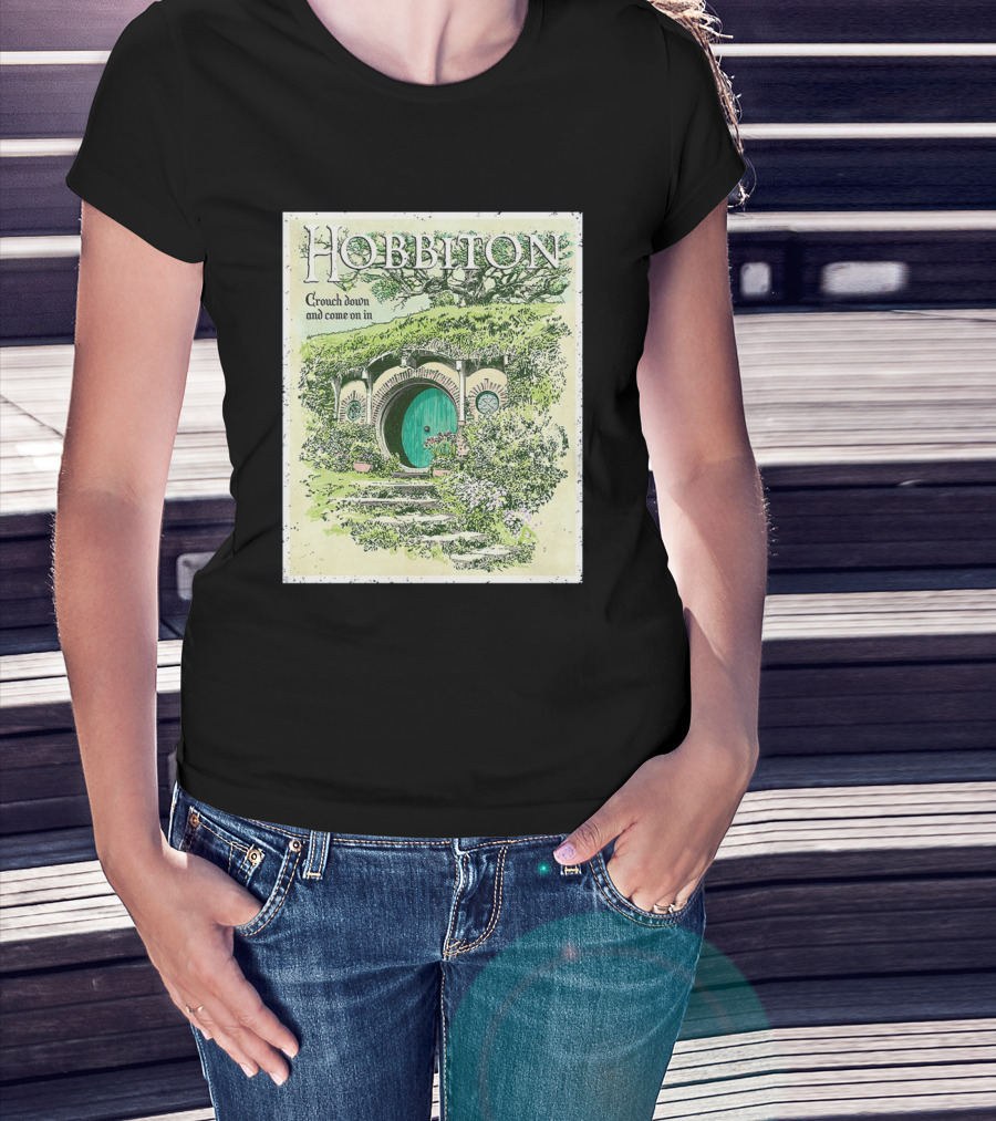 Hobbiton Crouch Down And Come On In With Illustrated Green Door And Garden Path T-Shirt