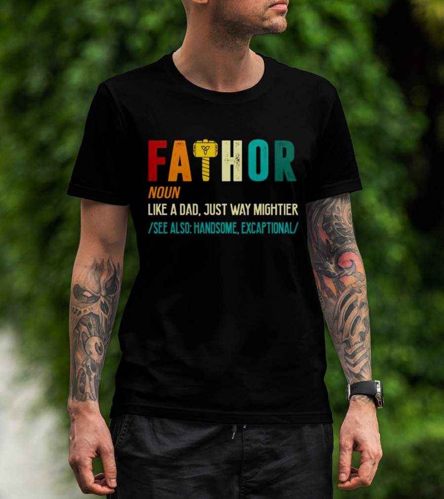 The Fathor Noun Like a Dad Just Way Mightier See Also Handsome Excaptonal Hammer T-shirt is designed for everyday wear and a consistent fit. Fabric is pre-shrunk ring-spun cotton with durable stitching. See the size chart below for exact measurements.