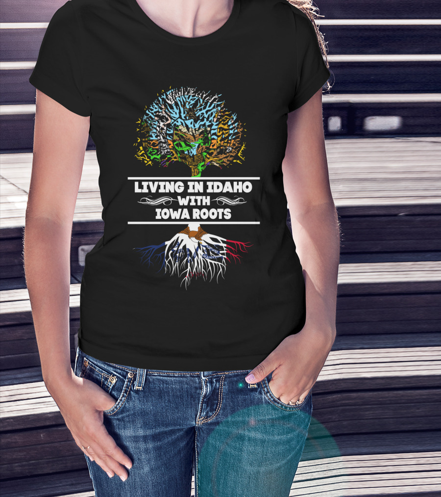 Living In Idaho With Iowa Roots Tree Design Featuring State Maps And Colors T-Shirt