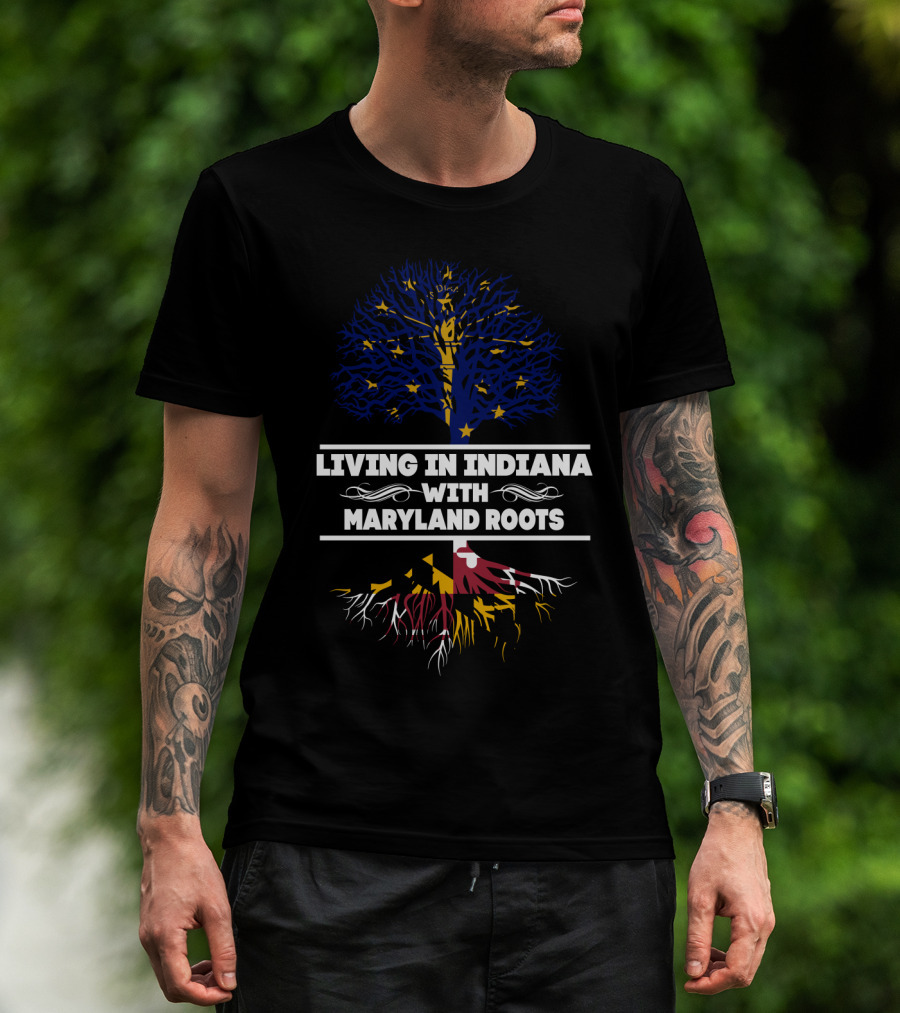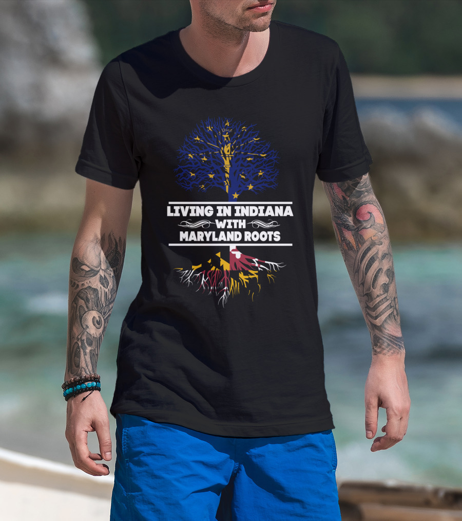 The Indiana Living with Strong Maryland Roots Featuring State Flag Colors of Blue and Yellow Tree T-shirt is designed for everyday wear and a consistent fit. Fabric is pre-shrunk ring-spun cotton with durable stitching. See the size chart below for exact measurements.