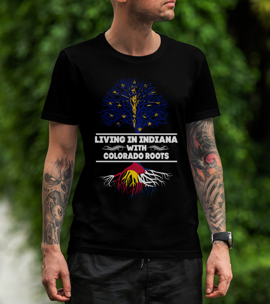 Indiana Skyline And Colorado Flag Tree Symbolizing Living In Indiana With Colorado Roots T-Shirt