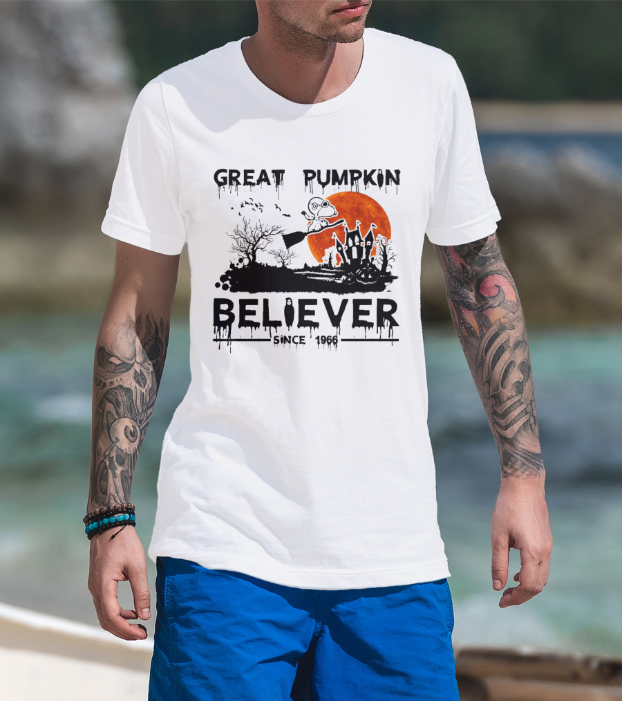 Great Pumpkin Believer Since 1966 Snoopy Flying On Broomstick Halloween Scene T-Shirt
