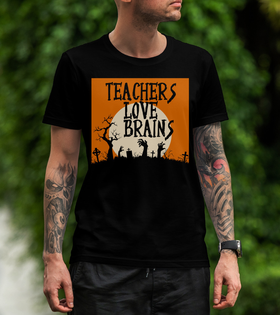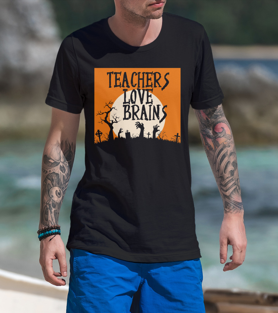 Teachers Love Brains Funny Halloween Costume With Zombie Hands And Graveyard Moon Scene T-Shirt