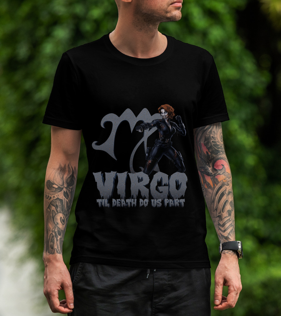 The Black Widow Virgo Til Death Do Us Part Marvel Fans T-shirt is designed for everyday wear and a consistent fit. Fabric is pre-shrunk ring-spun cotton with durable stitching. See the size chart below for exact measurements.