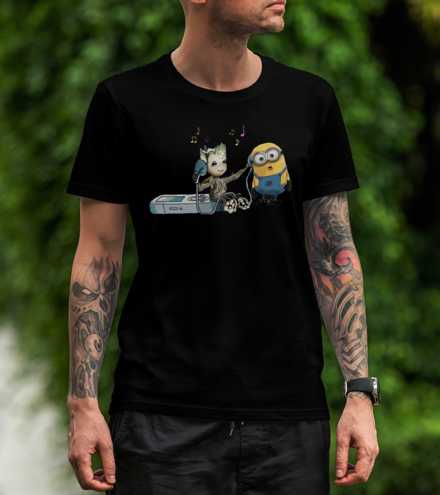 Groot And Minion Sharing Music With Headphones And Music Notes T-Shirt