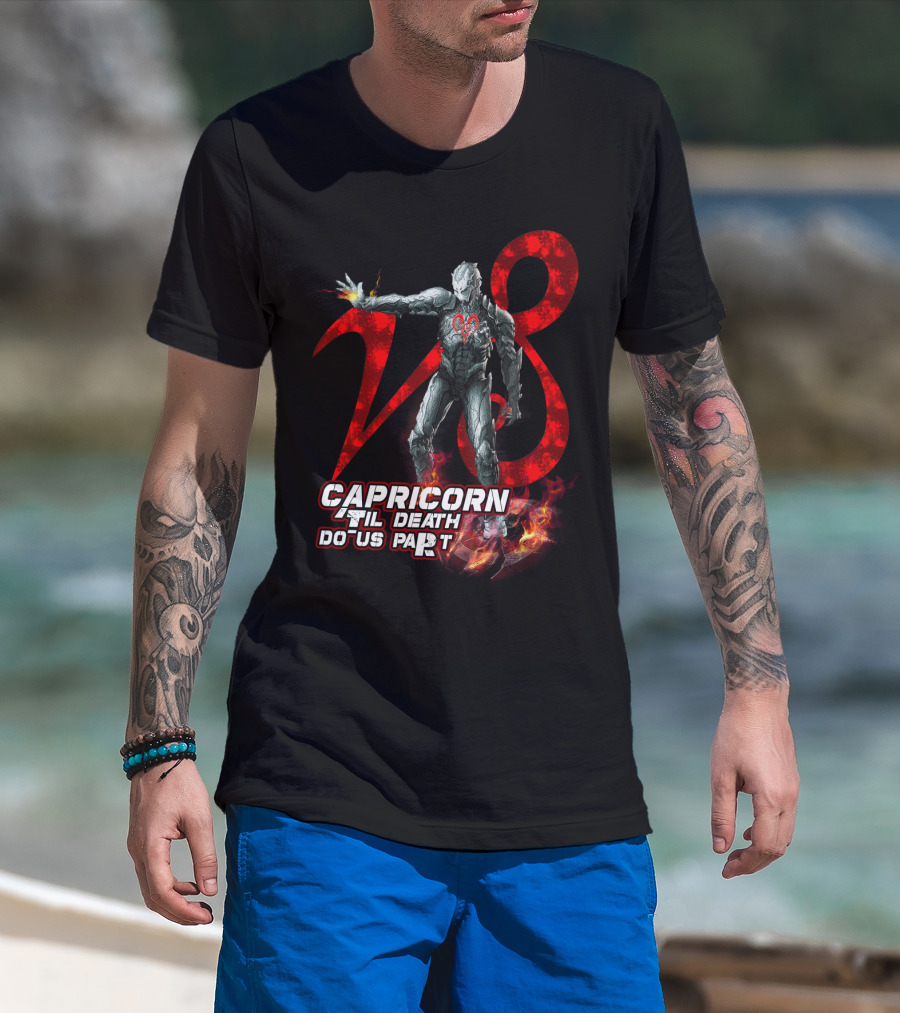The Capricorn Til Death Do Us Part with Iron Man Armor and Red Number Eight T-shirt is designed for everyday wear and a consistent fit. Fabric is pre-shrunk ring-spun cotton with durable stitching. See the size chart below for exact measurements.