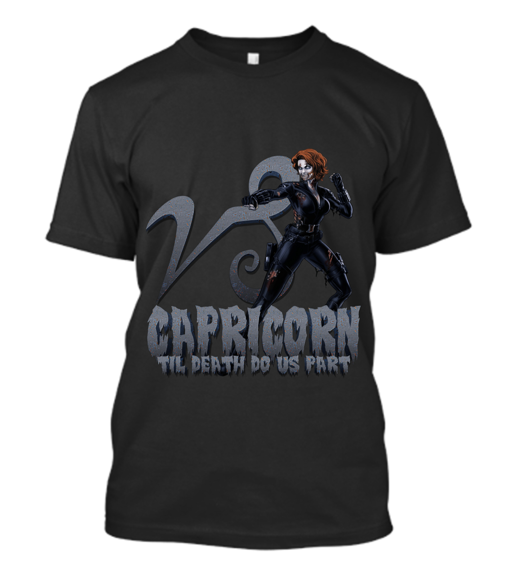 The Capricorn Til Death Do Us Part Black Widow Marvel Fans T-shirt is designed for everyday wear and a consistent fit. Fabric is pre-shrunk ring-spun cotton with durable stitching. See the size chart below for exact measurements.
