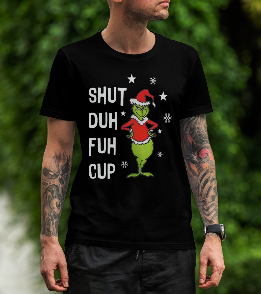 GRINCH SHUT DUH FUH CUP Christmas Humor Dr. Seuss Styled Santa Hat Snowflakes T-Shirt