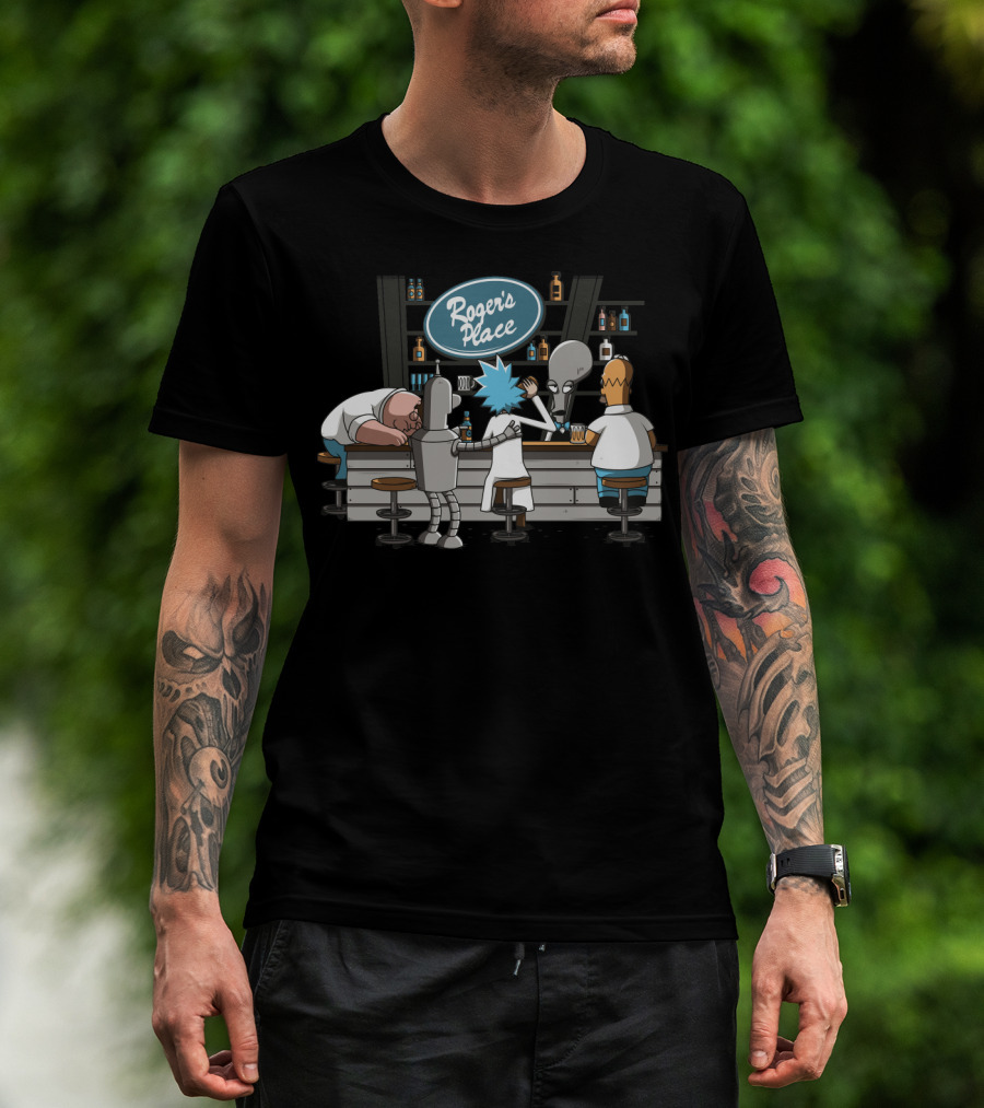 Rick And Morty Meets Roger American Dad Bar Scene Featuring Iconic Characters At Roger's Place T-Shirt