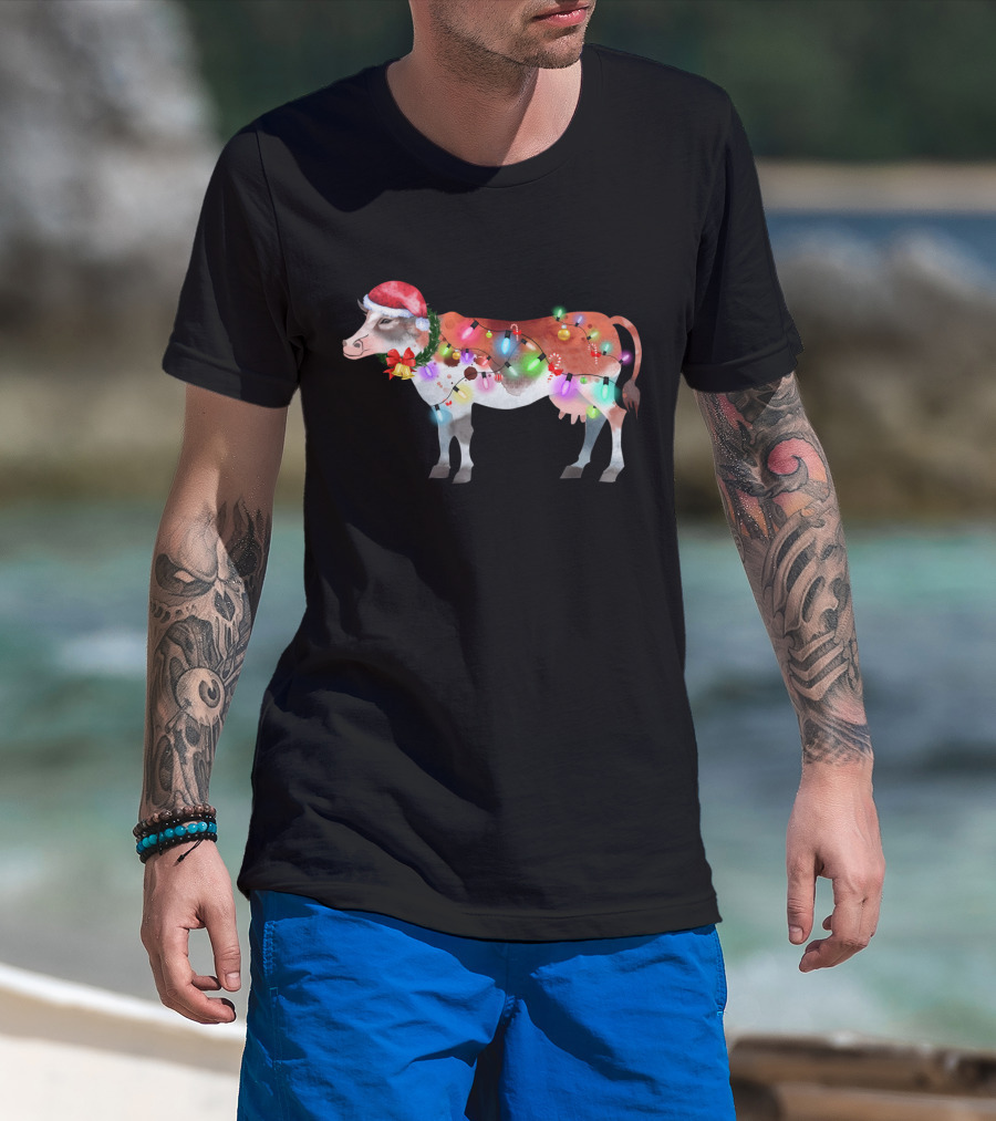 Christmas Lights Santa Hat Cow Festive Holiday T-Shirt