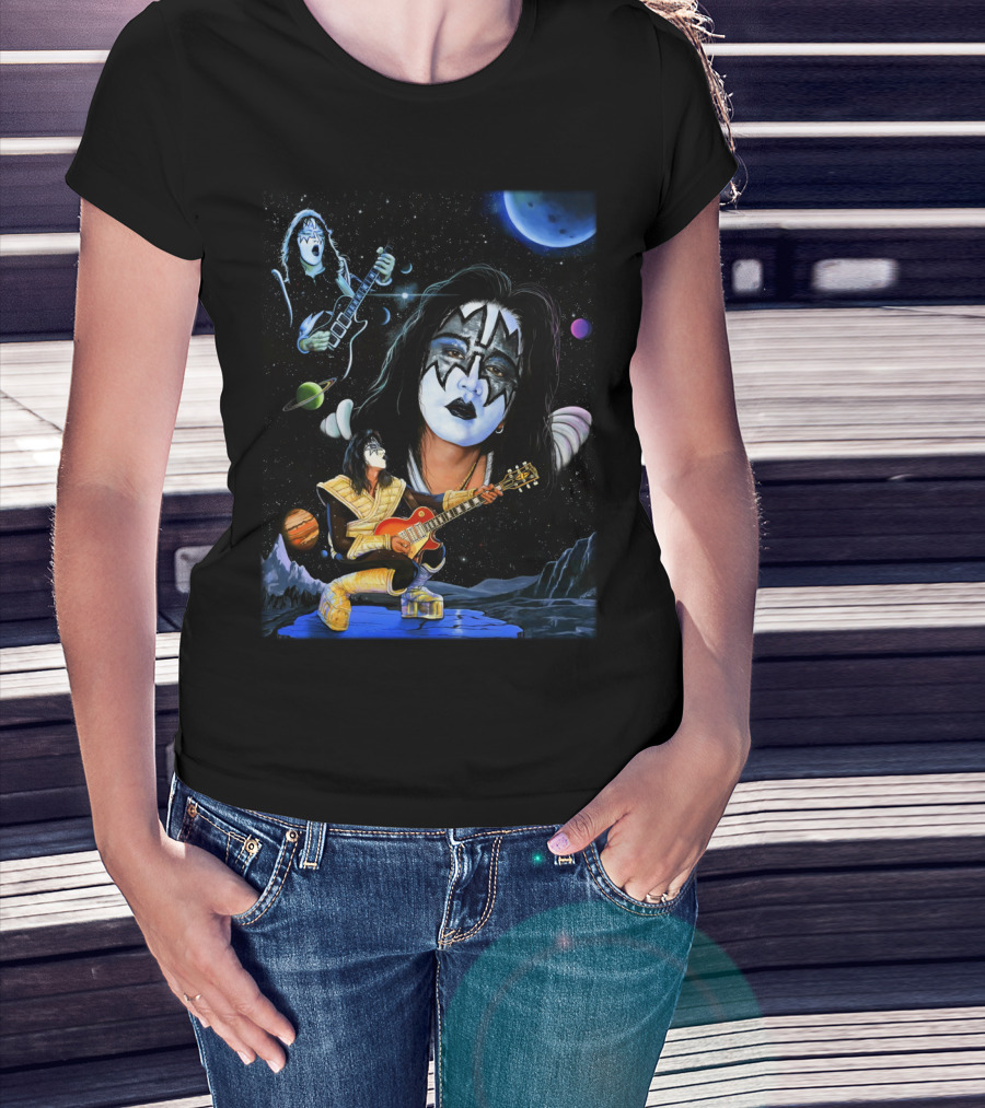 The Ace Frehley Kiss Cosmic Rock Guitarist with Space Imagery and Planets T-shirt is designed for everyday wear and a consistent fit. Fabric is pre-shrunk ring-spun cotton with durable stitching. See the size chart below for exact measurements.