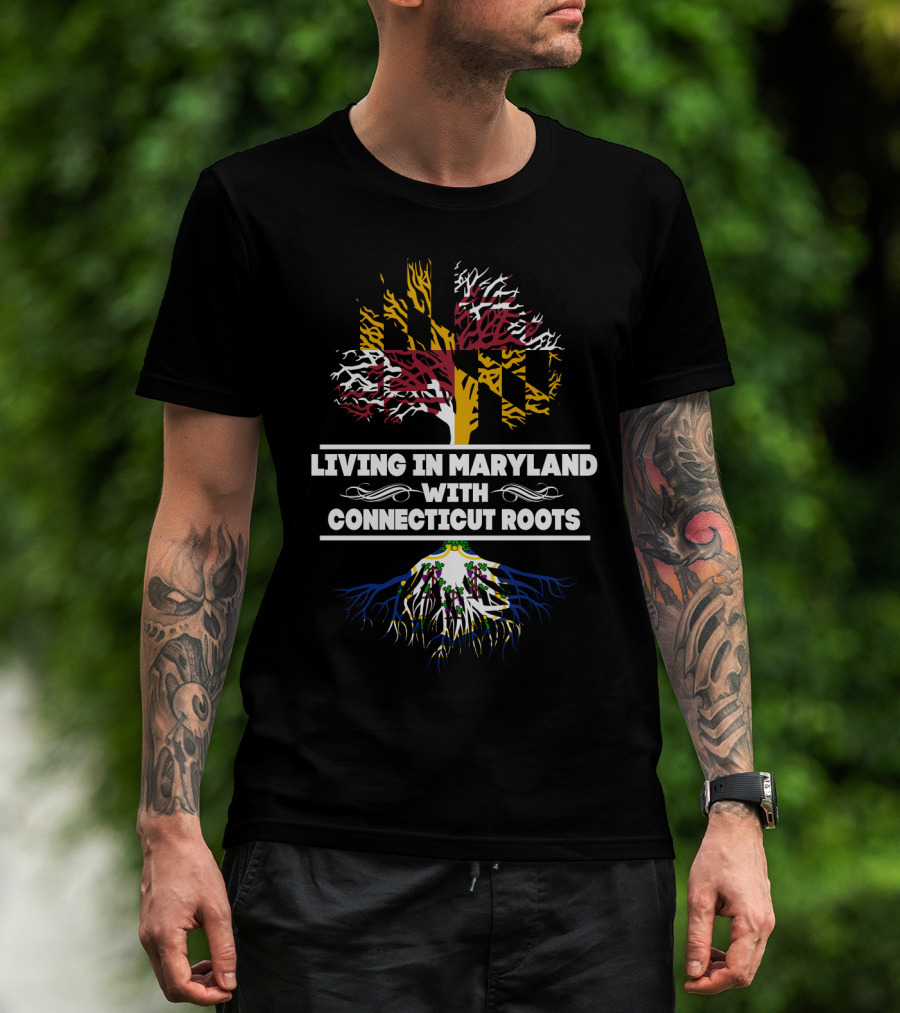 Living In Maryland With Connecticut Roots Featuring Maryland Flag Tree And Connecticut Roots T-Shirt