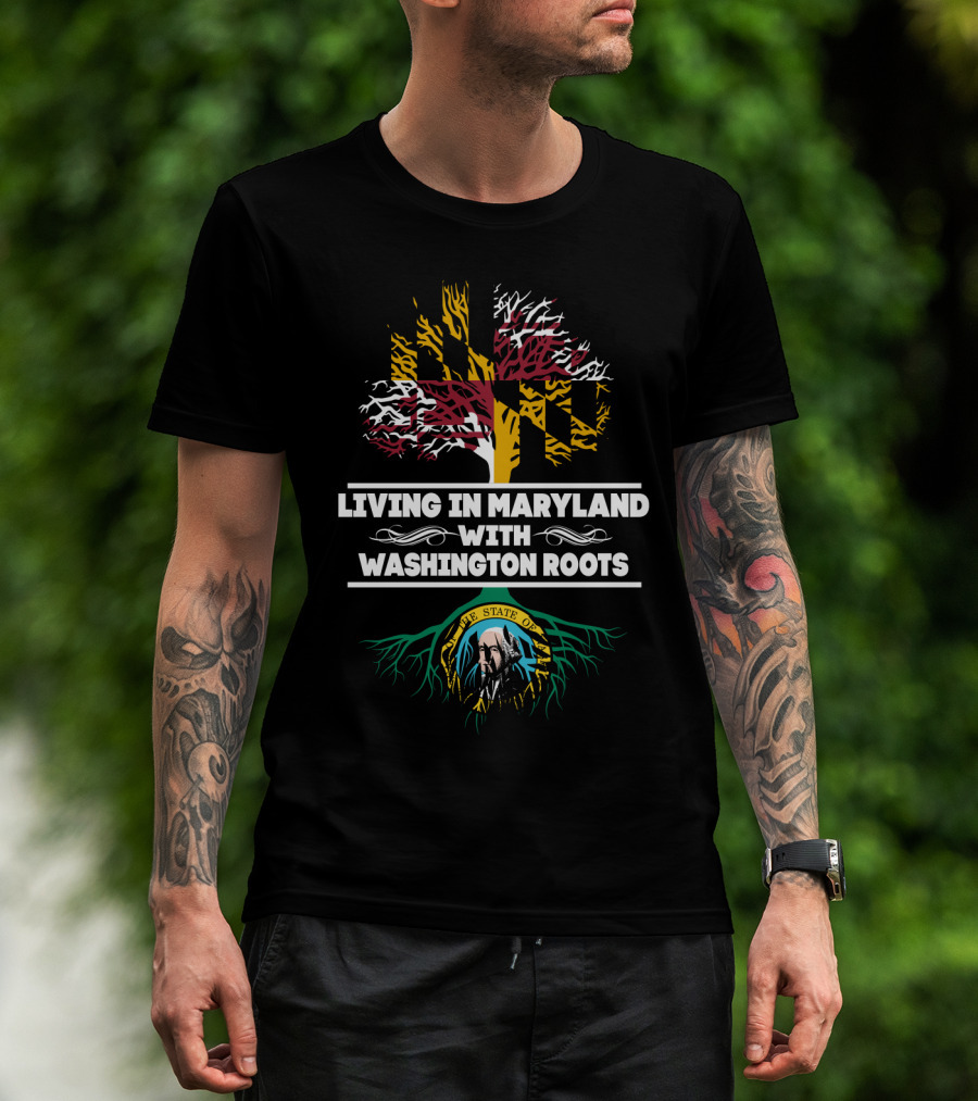 Living In Maryland With Washington Roots Featuring Maryland Flag Tree And Washington State Seal T-Shirt