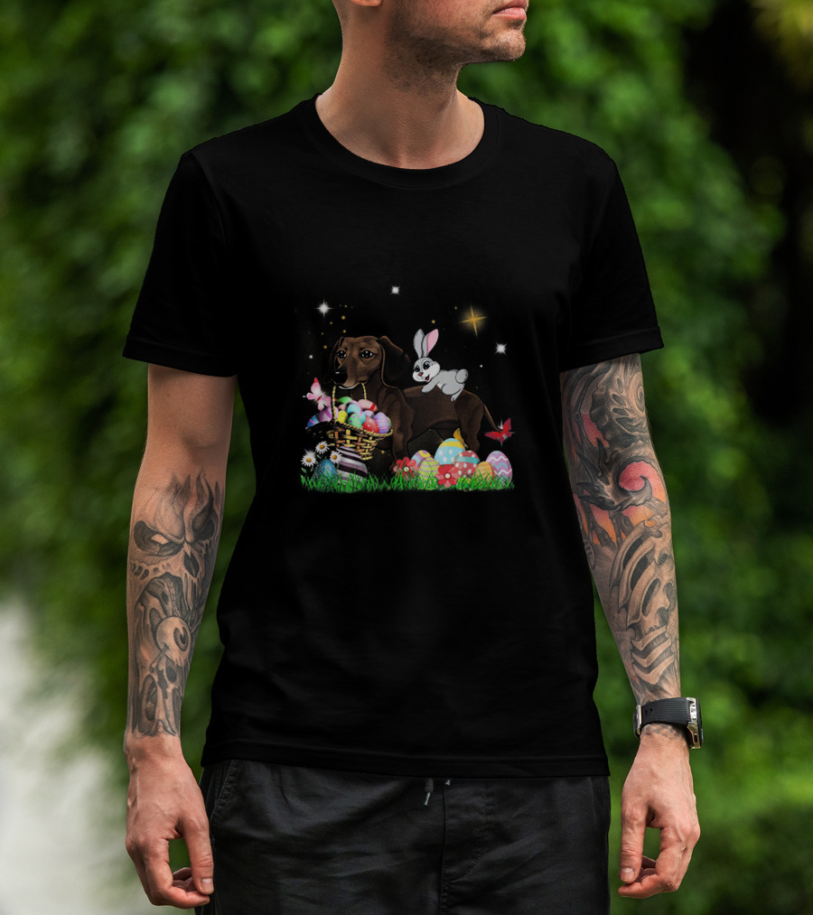 Dachshund With Easter Basket Rabbit And Colorful Eggs Under Stars T-Shirt