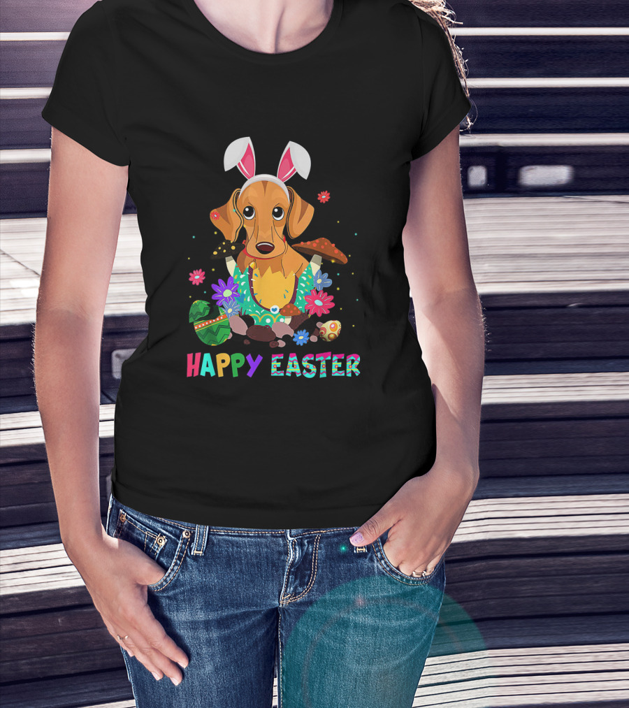 Happy Easter Bunny Ears Dachshund Dog With Colorful Eggs And Flowers T-Shirt