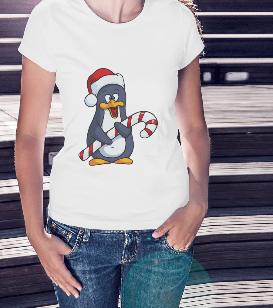 Jolly Christmas Penguin With Santa Hat And Candy Cane T-Shirt