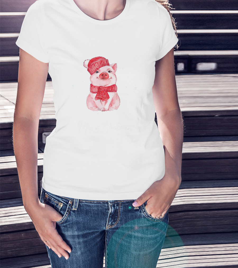 Merry Christmas Cute Pig With Red Scarf And Hat T-Shirt