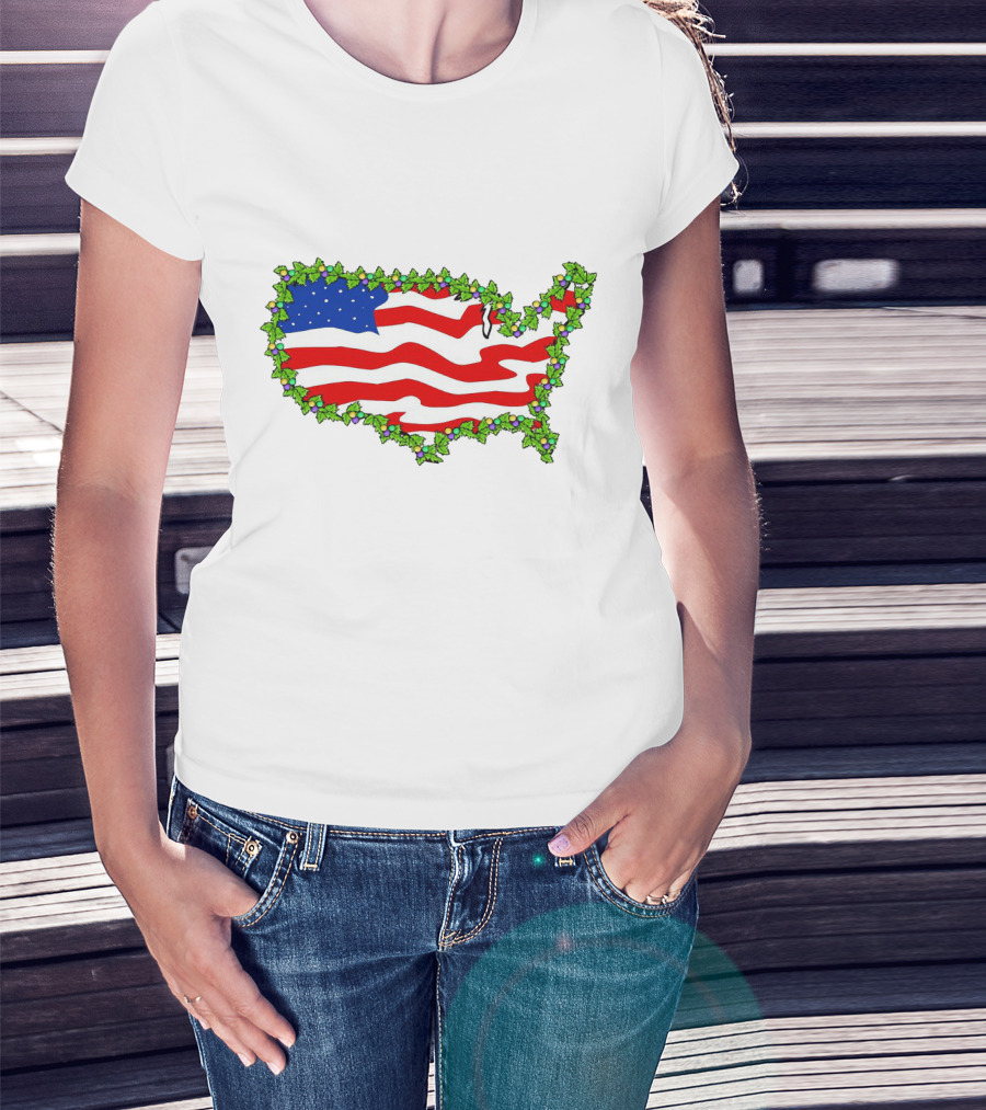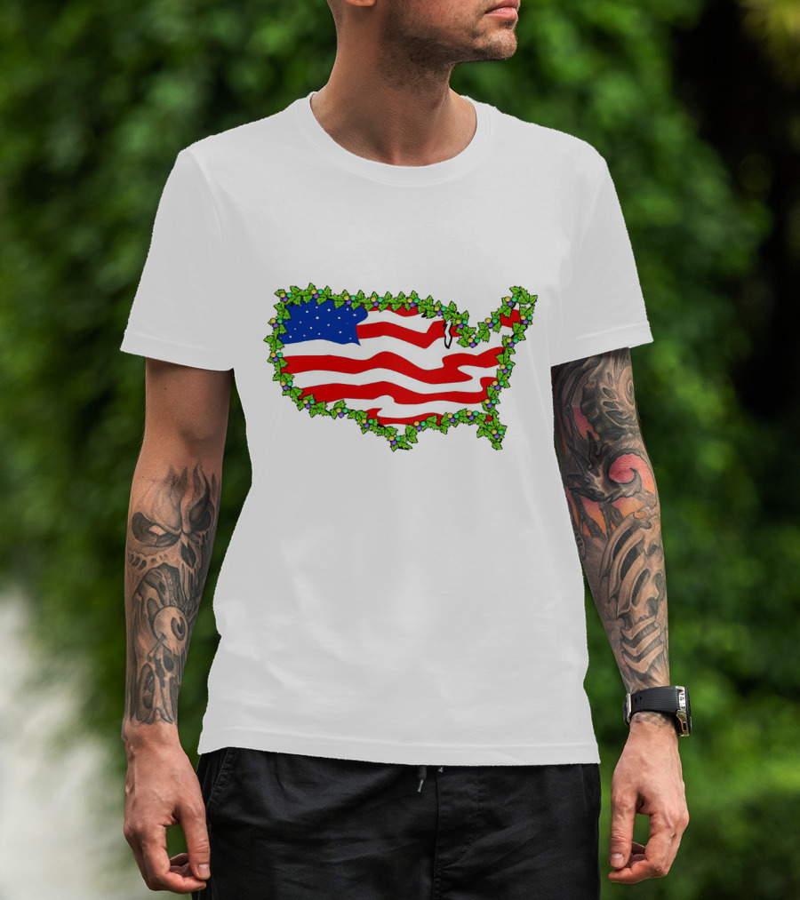 United States Map With Flag And Christmas Holly Decoration T-Shirt