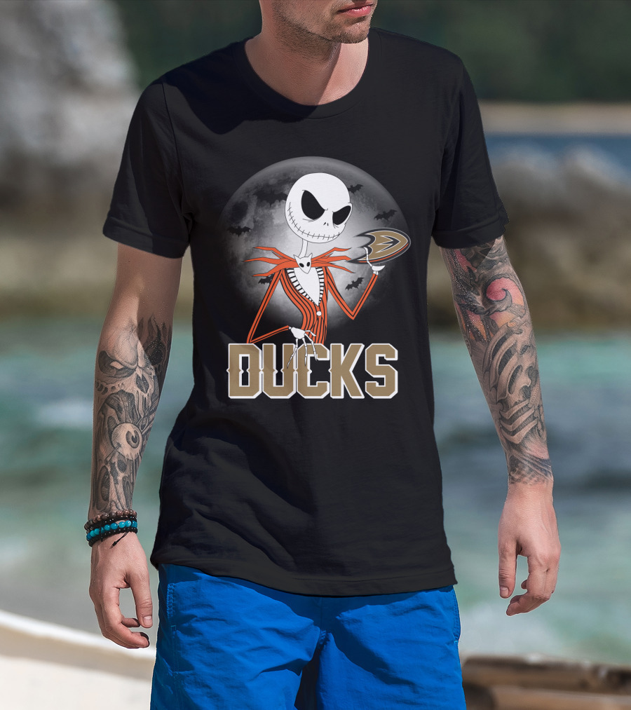 Jack Skellington Anaheim Ducks Halloween Moon And Bats T-Shirt