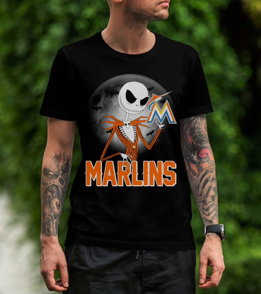 Jack Skellington Miami Marlins Halloween Moon Bat T-Shirt