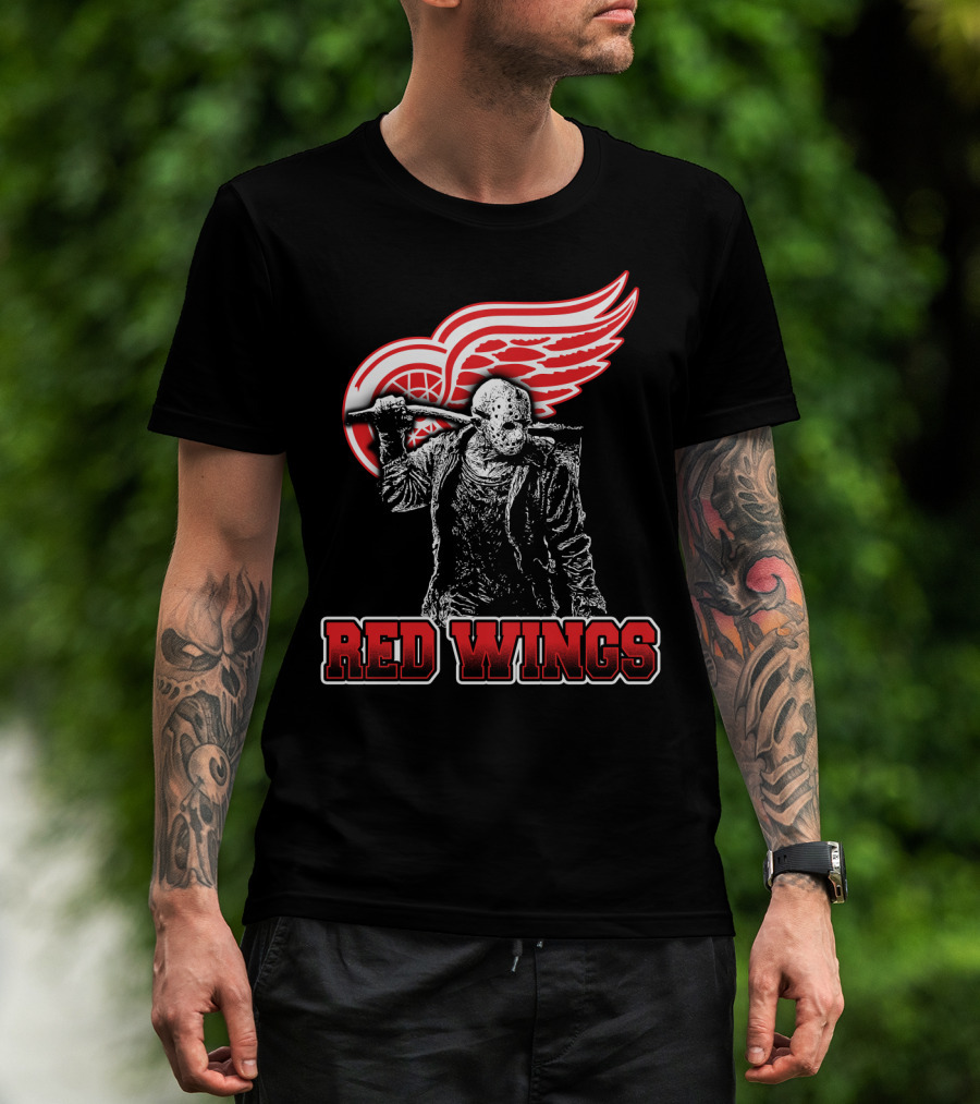 Jason Voorhees With Hockey Mask And Machete In Front Of Detroit Red Wings Logo Text Red Wings T-Shirt