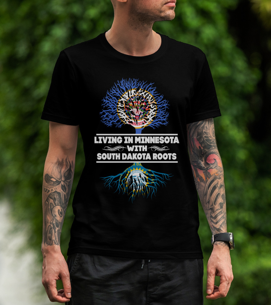 Living In Minnesota Featuring State Emblems With South Dakota Roots Heritage T-Shirt